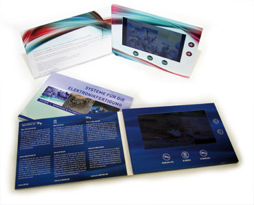 Die Videobroschüre kombiniert Print, Video und Audio und bietet dem Kunden damit ein faszinierendes Erlebnis und Ihnen eine besondere Möglichkeit der Auftragsakquise. Die Besonderheit: Mit dem Aufklappen der individuell gestalteten Broschüre startet automatisch ein Video. Um die Wertigkeit des Produkts oder der Dienstleitung adäquat wiederzugeben, verarbeiten wir ausschließlich 7“ und 10“ Bildschirme. Die Videokarten produzieren wir in den 3 Größen DIN A5, DIN A4 und 21x21 cm.